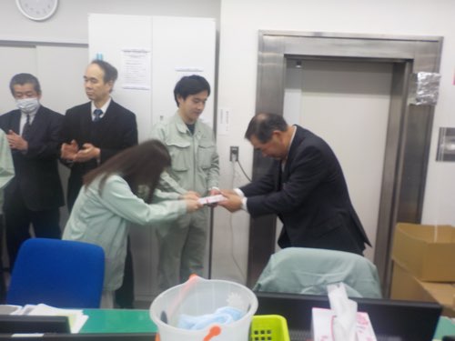 年男の社長のお話しも終わり、9日が成人式の2名の社員に会社と互助会からお祝いを渡しました。
