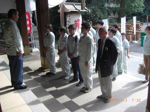 各工事車両の管理責任者や社有車を運転する方等、早朝より一人の遅刻者もなく大宮八幡宮にお集まりいただきました。